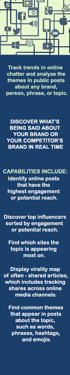 With consumers spending more and more time connected online and using social media, and the increasing growth of digital media and social marketing initiatives, keeping tabs on the chatter online is imperative for brand management. Our social listening tool gives you the ability to see what is being posted and shared anywhere online (globally) about your brand (a new product/LTO, news events, a digital campaign, etc.).